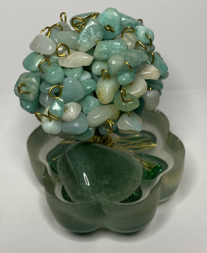 Minerály v koruně: amazonity vpletené do koruny stromu, o velikosti XS (do 1 cm)