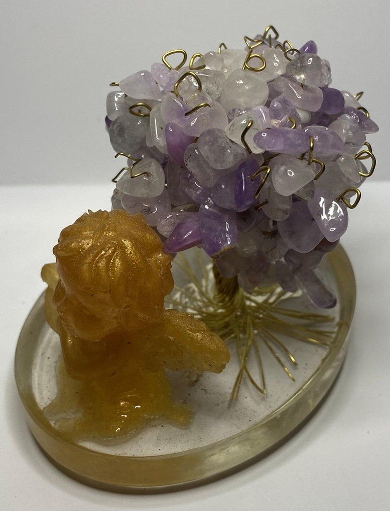 Minerály v koruně: ametysty vpletené do koruny stromu, o velikosti XS (do 1 cm), pocházející
