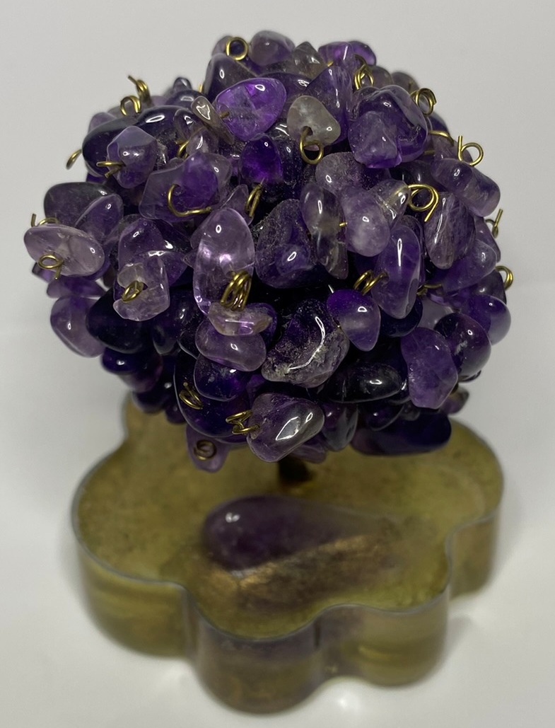 Minerály v koruně: ametysty vpletené do koruny stromu, o velikosti XS (do 1 cm)
