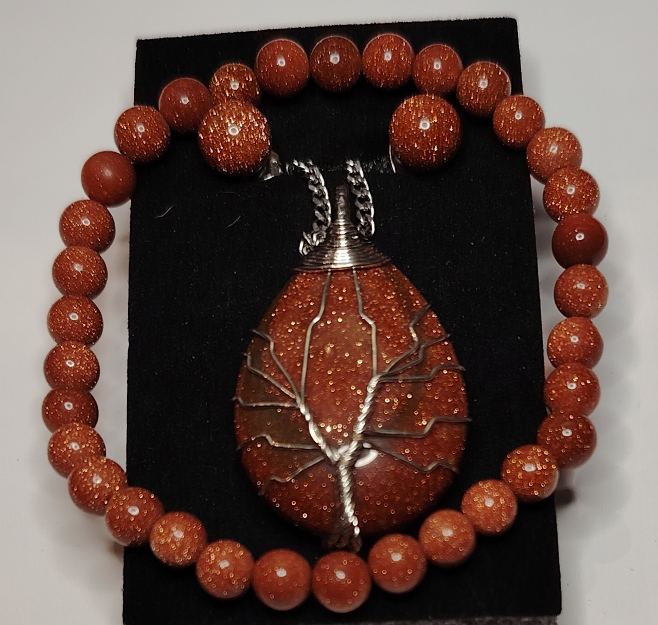 Přívěsek se skládá z přívěsku avanturínu zlatého zasazeného do nerezové oceli 304, s vyplétaným stromem života. Avanturín je tvarovaný do slzy kabošonu. Přívěsek je na řetízku stříbrné barvy.
