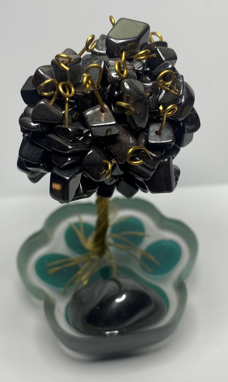 Minerály v koruně: hematity vpletené do koruny stromu, o velikosti XS (do 1 cm), pochází z Brazílie, přírodní, nepřibarvené.