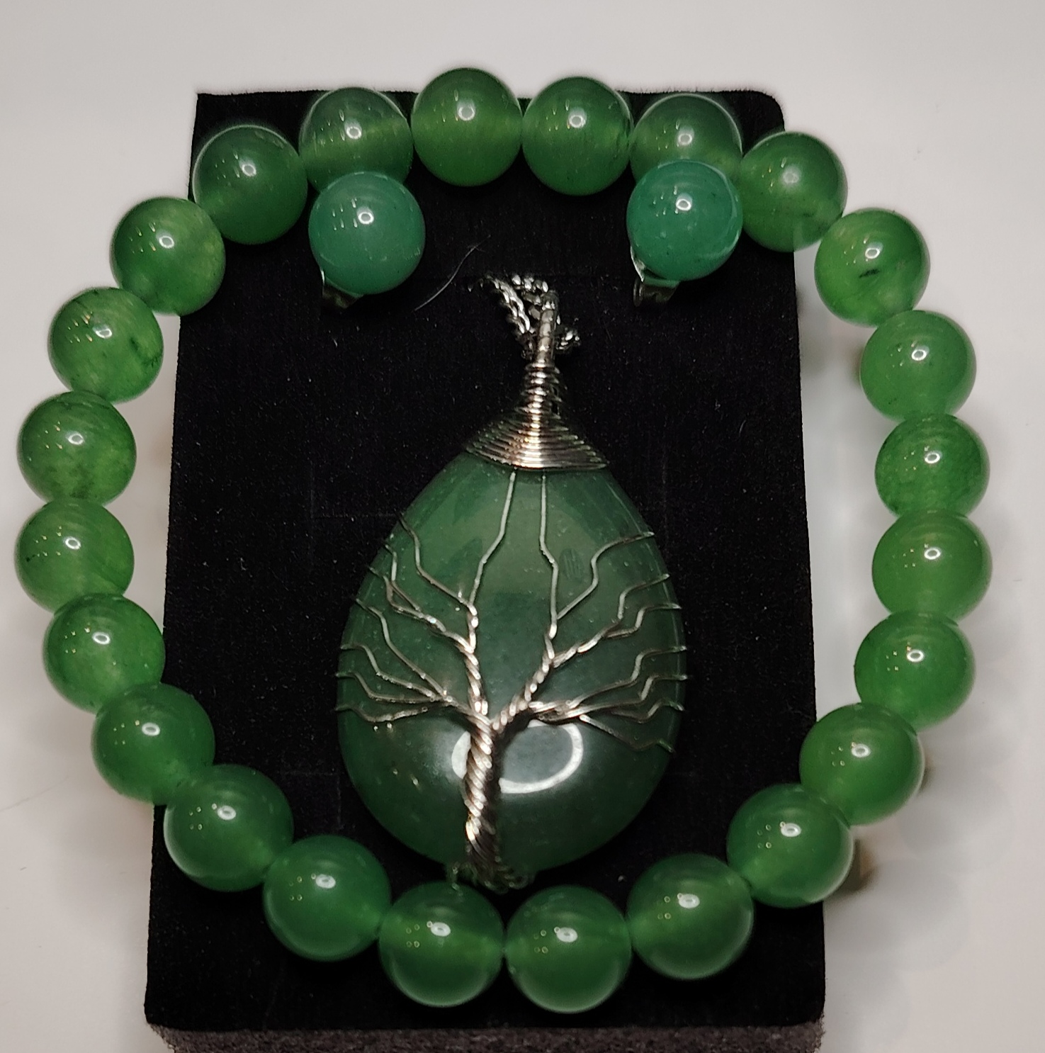 Přívěsek se skládá z přívěsku avanturínu zeleného zasazeného do nerezové oceli 304, s vyplétaným stromem života. Avanturín zelený je tvarovaný do slzy kabošonu. Přívěsek je na řetízku stříbrné barvy.