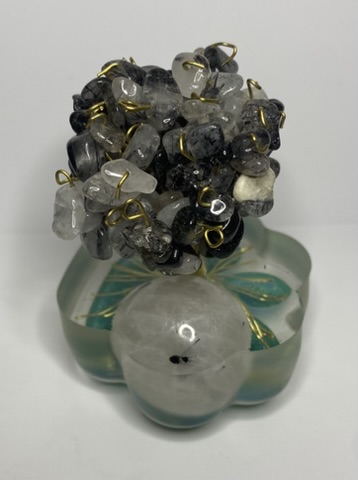 Minerály v koruně: křišťály s turmalíny vpletené do koruny stromu, o velikosti XS (do