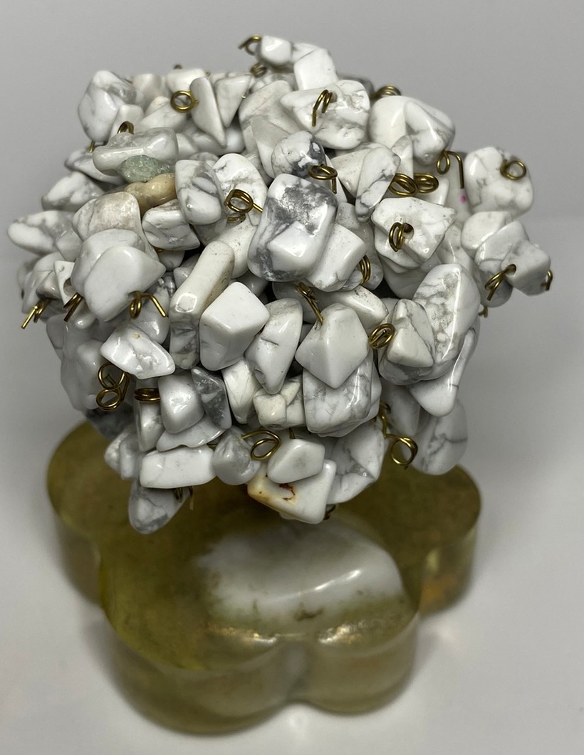 Minerály v koruně: magnezity vpletené do koruny stromu, o velikosti XS (do 1 cm)