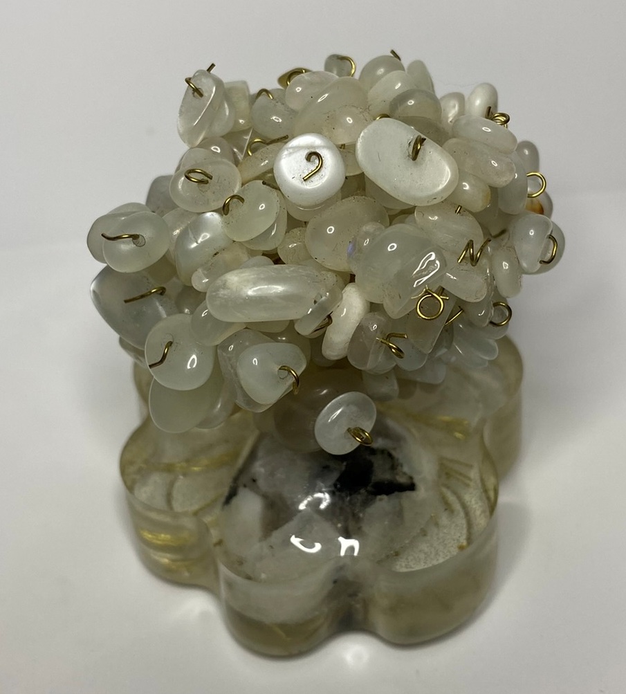 Minerály v koruně: měsíční kameny vpletené do koruny stromu, o velikosti XS (do 1 cm)