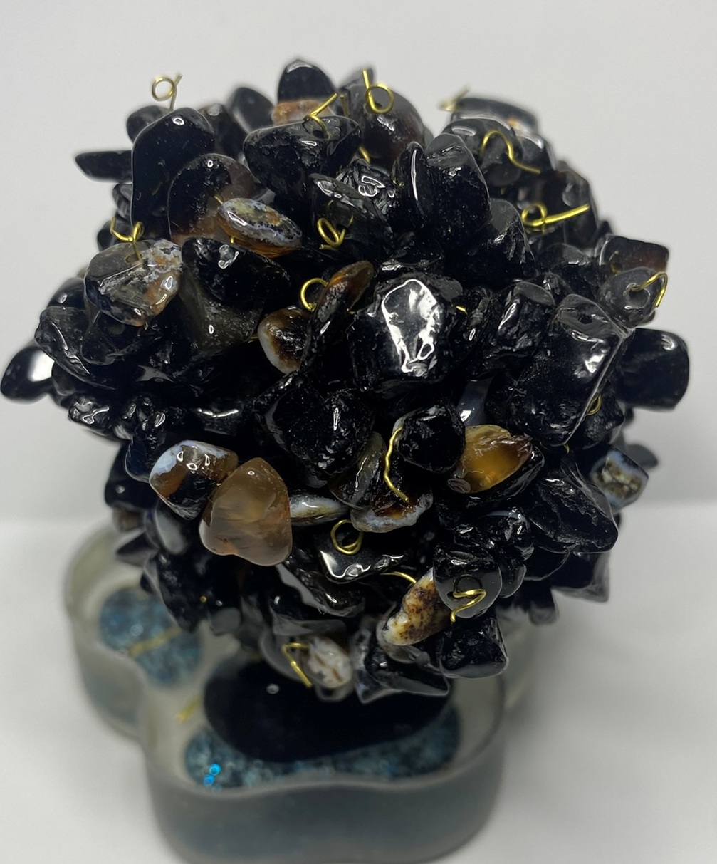 Minerály v koruně: onyxy vpletené do koruny stromu, o velikosti XS (do 1 cm)