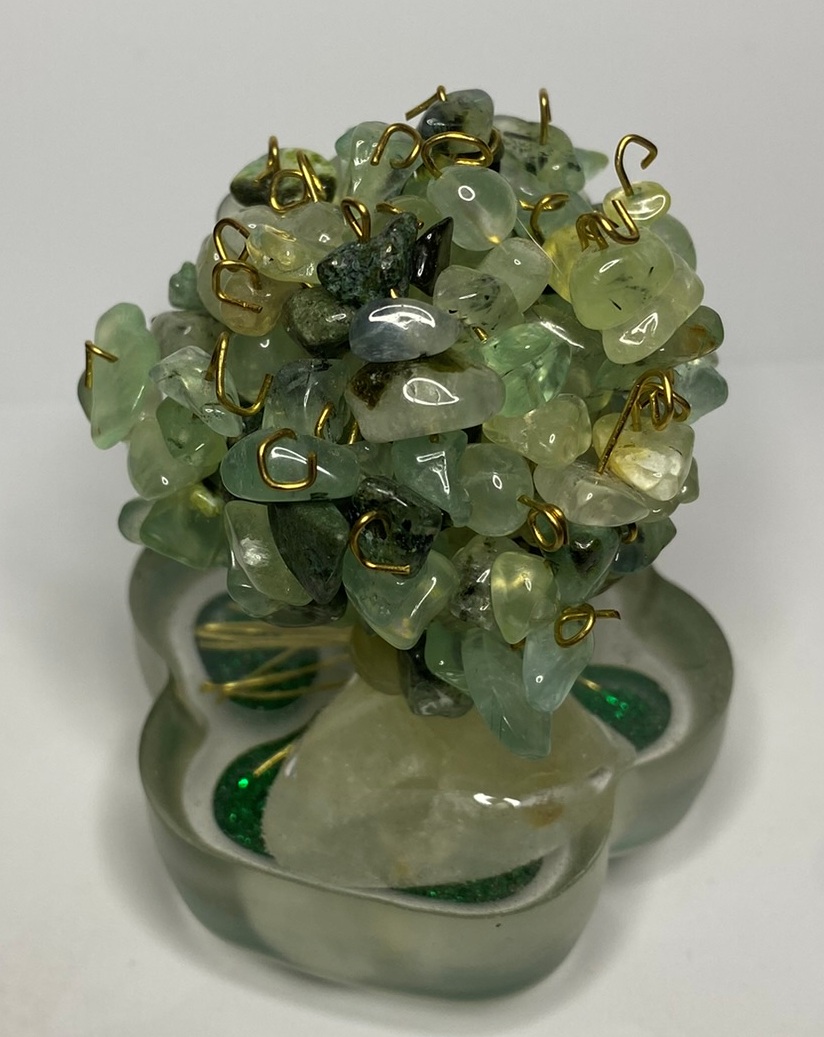 Minerály v koruně: prehnity vpletené do koruny stromu, o velikosti XS (do 1 cm)